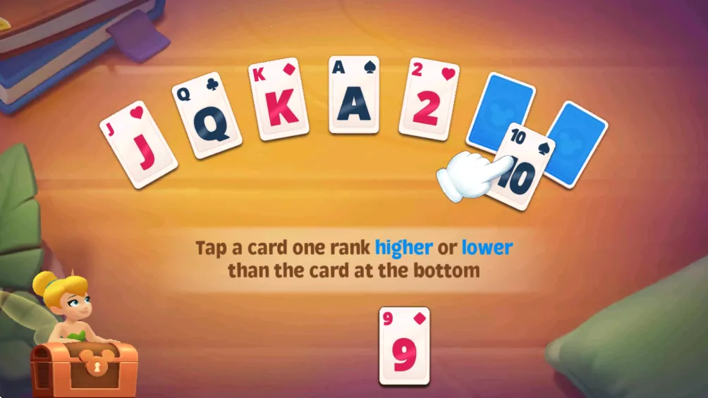 在三峰纸牌玩法基础上加入关卡挑战与迪士尼风格元素,支持玩家探索经典电影场景,与迪士尼角色相遇。1、点击一张比底部那张牌大一级或小一级的牌。