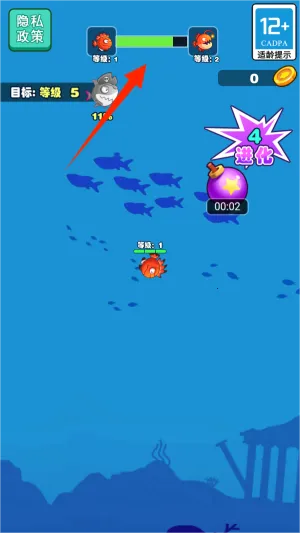 3、通过持续吞食场景中游动的其他鱼类生物,促使自身不断成长进化,屏幕顶端设有实时显示进化程度的进度条。