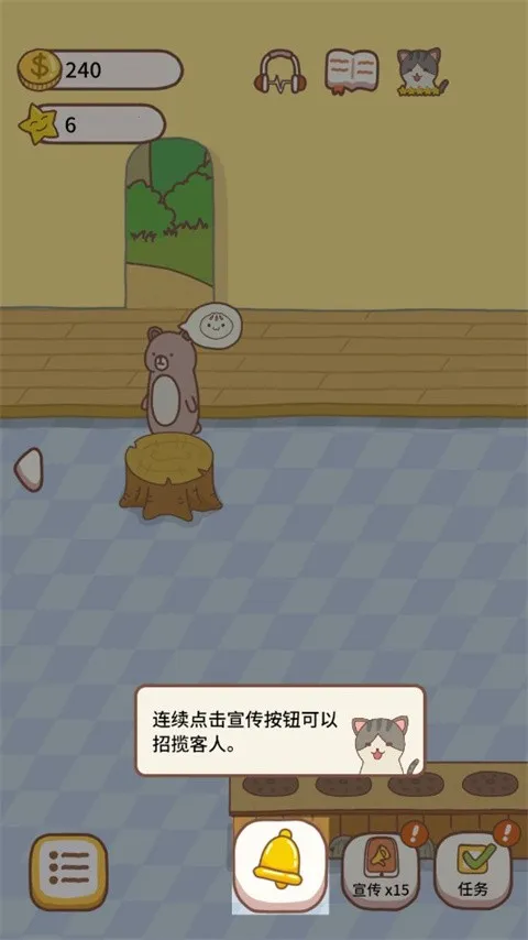 9、如果希望来更多顾客,我们要做一些宣传,点击这个小铃铛来招揽顾客,连续点击宣传按钮可以招揽客人。还可以通过大酬宾来招揽更多顾客;