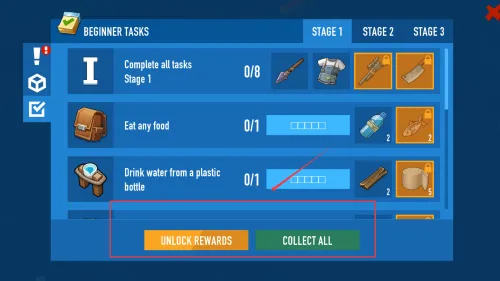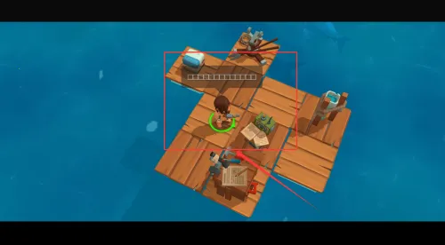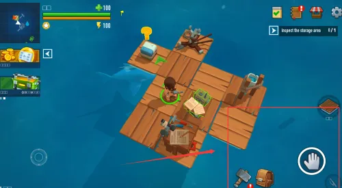 1、开局阶段玩家处于木筏之上,需要利用钩索打捞海洋中漂浮的物资箱,获取基础资源如木材与塑料等材料。
